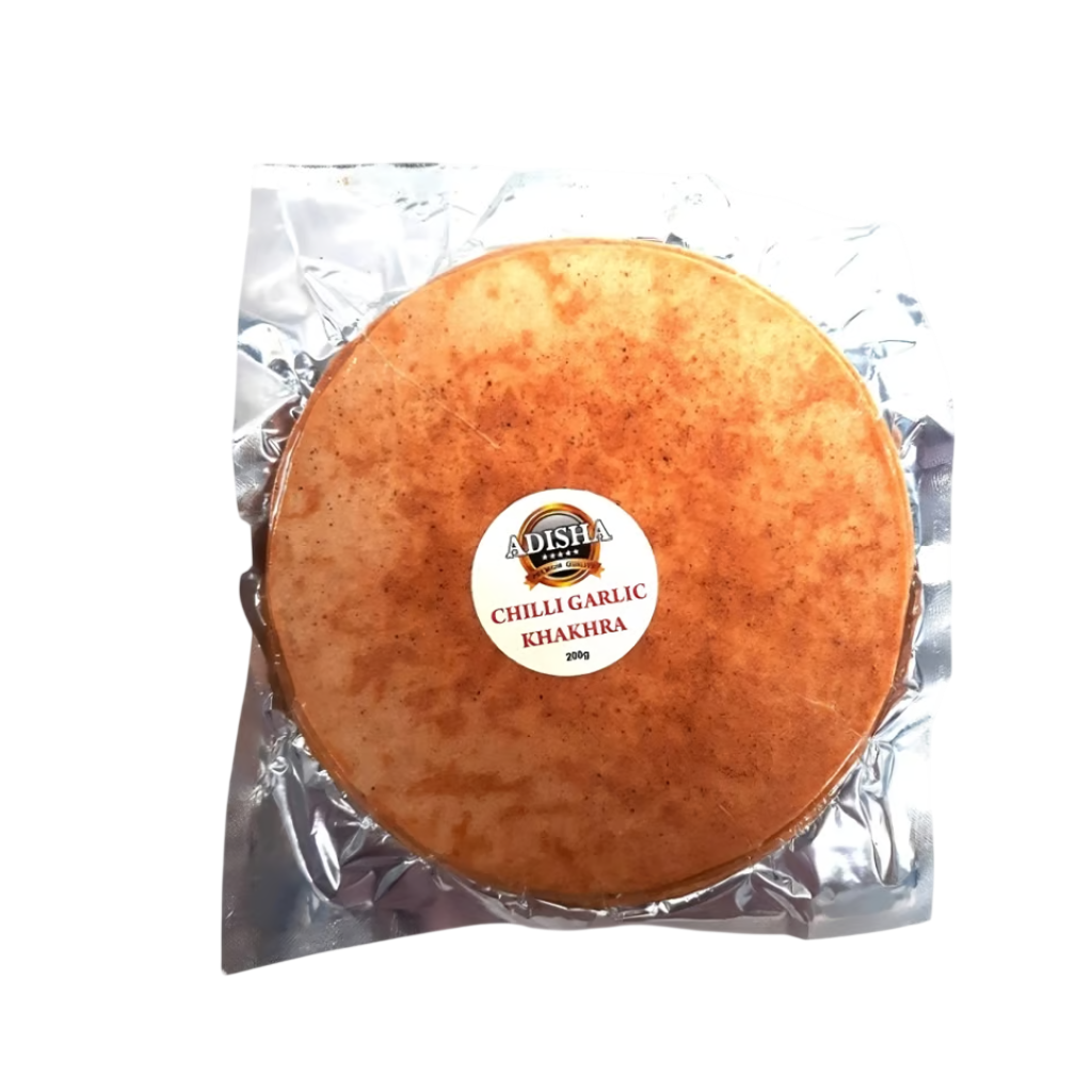 Adisha Chilli Garlic Khakhra is a crispy roasted snack made from whole wheat with bold chilli and garlic flavors.