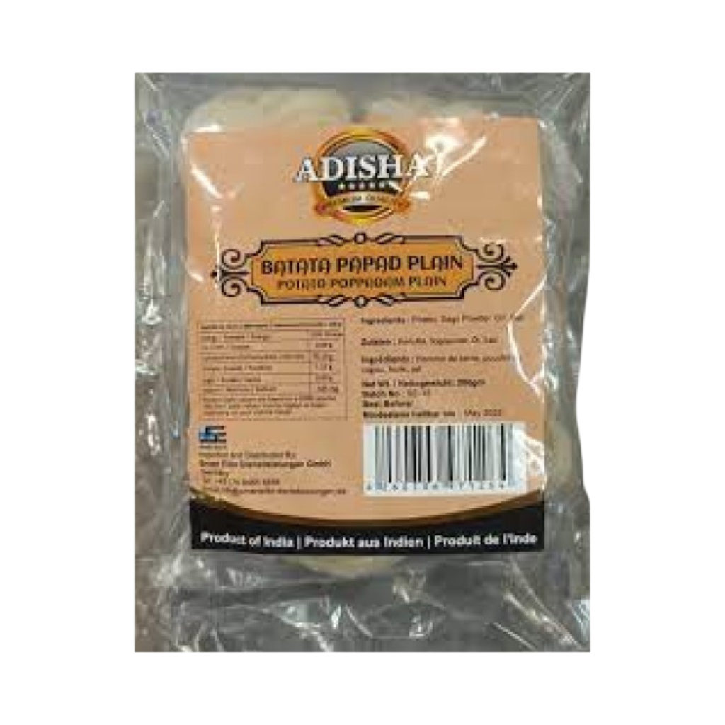 Adisha Potato Papad Plain is a crispy ready-to-fry snack made from quality potato starch.