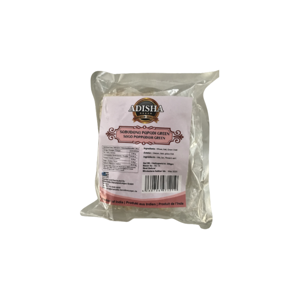 Adisha Sabudana Papad Green: Flavored sabudana papad with added spices for unique taste. Crispy and light when fried. Perfect snack option. Enjoy anytime.