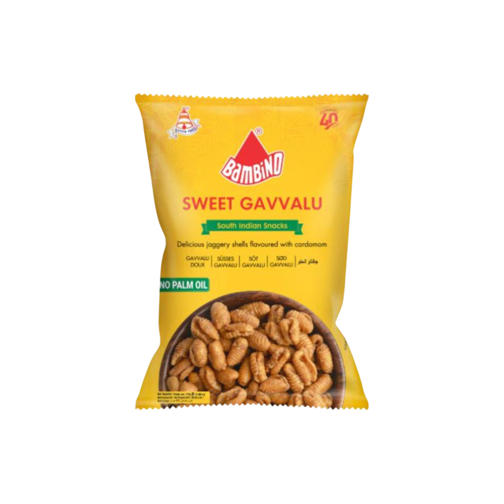 Bambino Sweet Gavvalu: Sweet crunchy snack shaped like shells and coated with jaggery. Traditional festive treat. Rich and delicious taste. Perfect for special occasions.