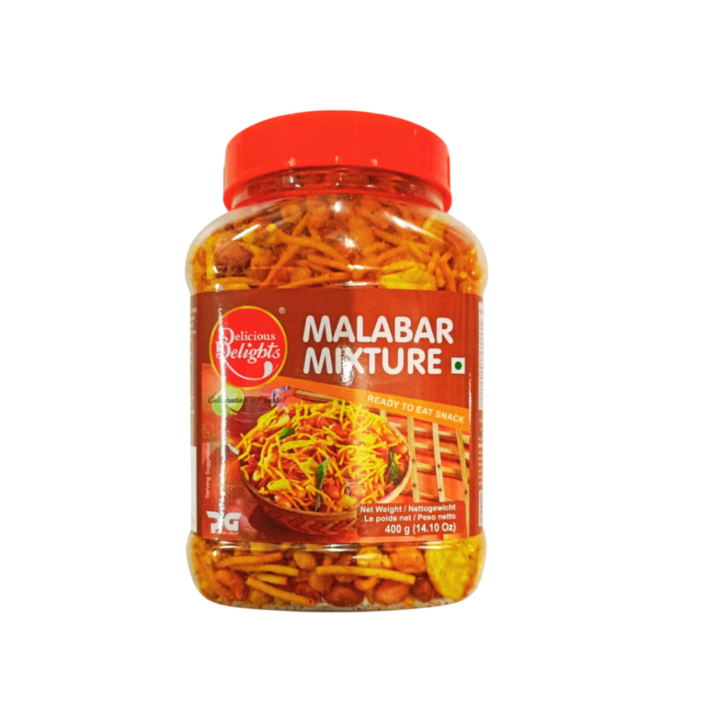 Daily Delight Malabar Mixture 400g: Spicy and crunchy snack mix with authentic Kerala flavors. Rich blend of sev, peanuts, and spices. Perfect for snacking. Enjoy anytime.