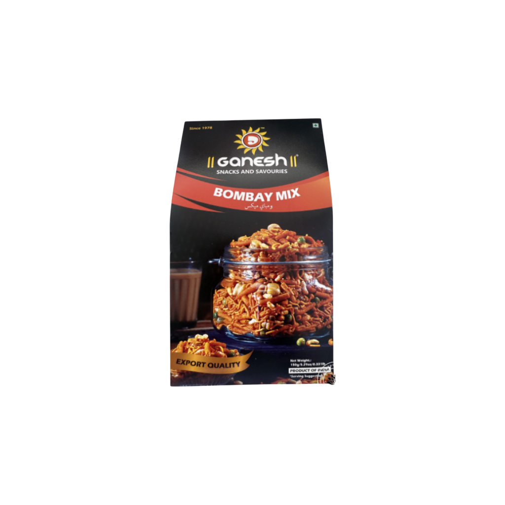 Ganesh Bombay Mix 150g: Classic Indian snack mix with sev, peanuts, and spices. Crunchy and flavorful texture. Perfect for tea-time snacking. Enjoy anytime.