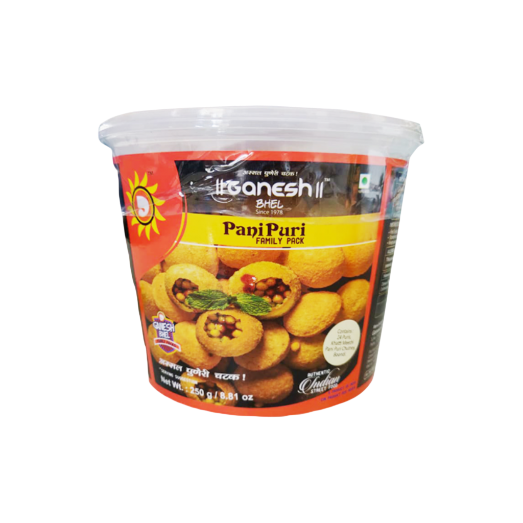 Ganesh Panipuri Family Pack 250g: Ready puris and ingredients for making pani puri at home. Crispy and delicious. Perfect for family snacks. Enjoy street style taste.