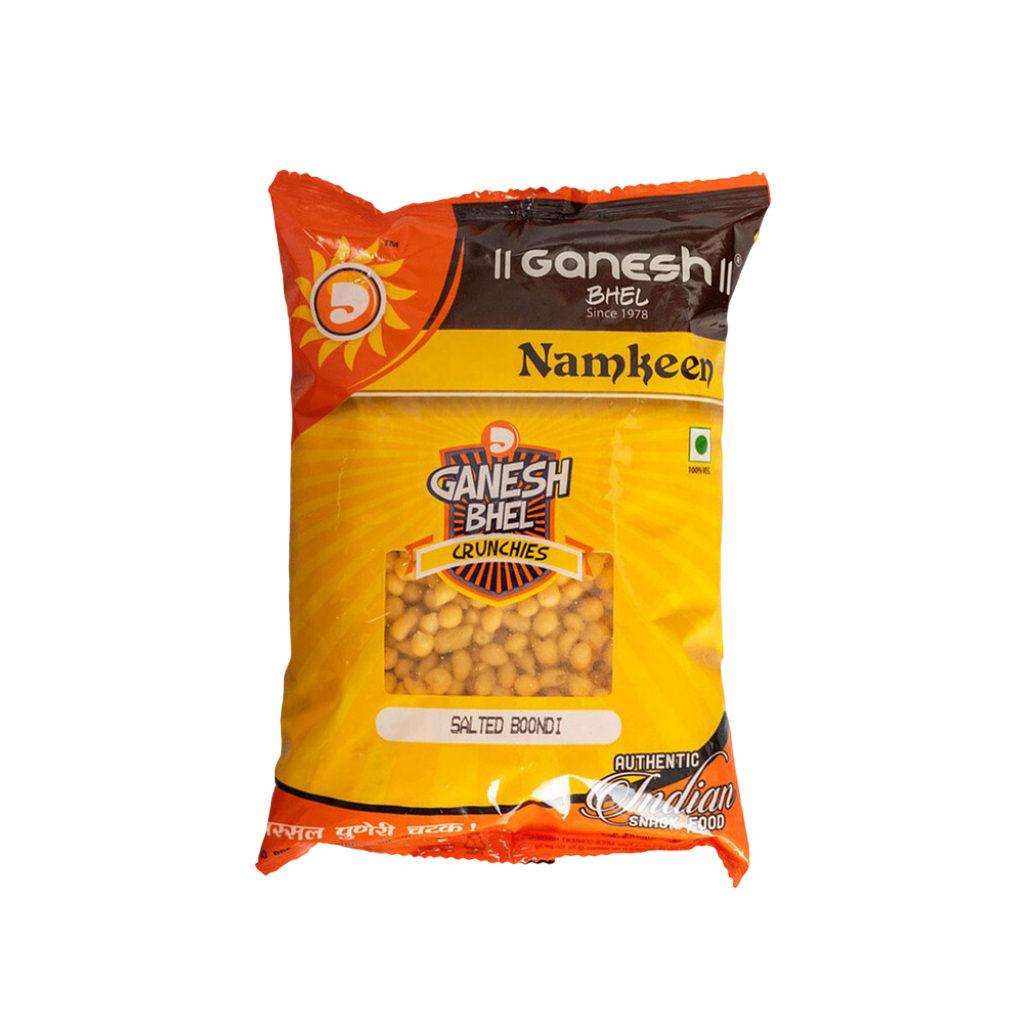 Ganesh Salted Boondi 200g: Crispy gram flour pearls with light salt seasoning. Perfect for snacks or raita. Crunchy and tasty. Enjoy anytime.