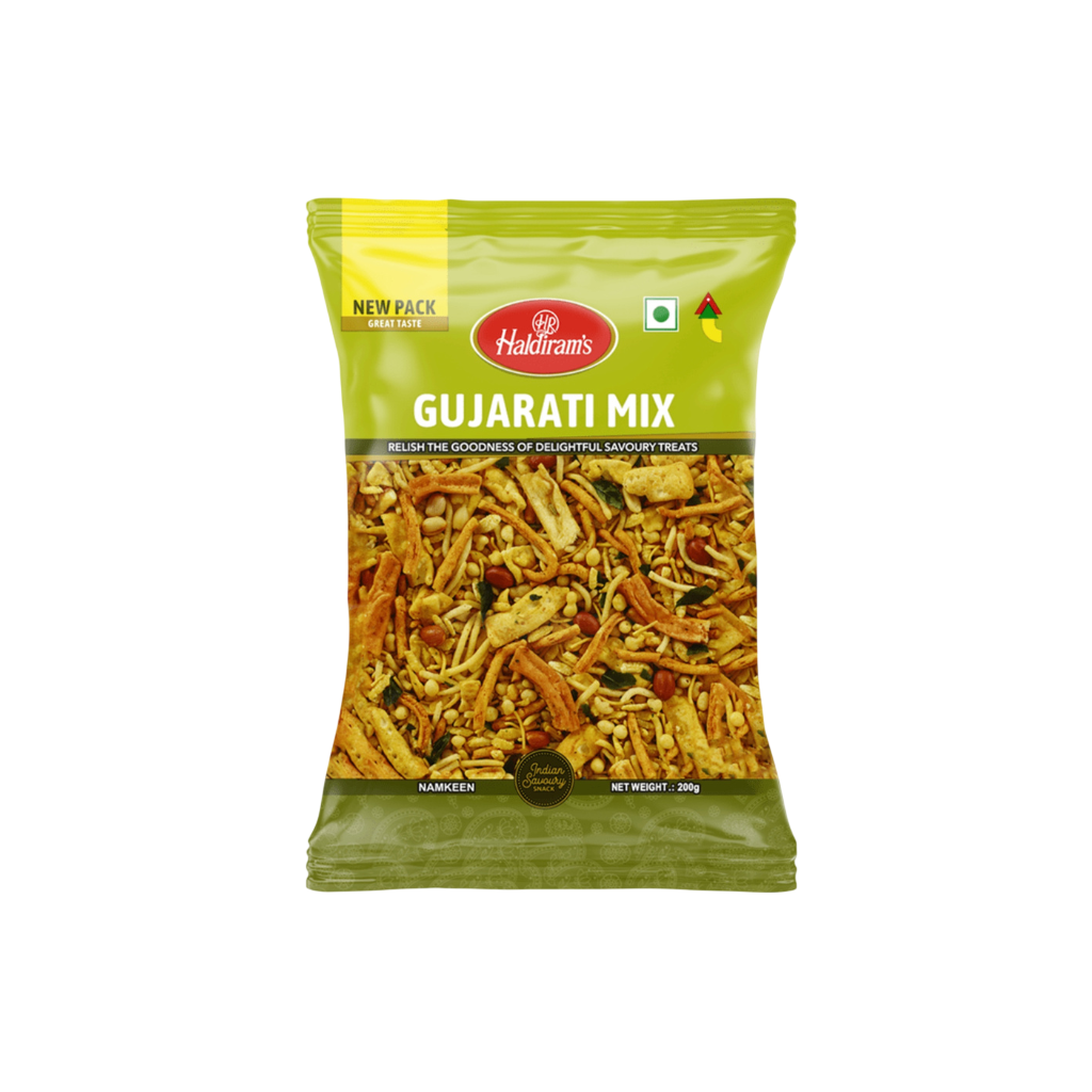 Haldiram Gujarati Mixture 200g: Traditional Gujarati snack mix made with crunchy sev, peanuts, and spices. Offers a mild sweet and spicy flavor combination. Perfect for enjoying with tea or as a light snack. Packed for freshness and crisp texture.