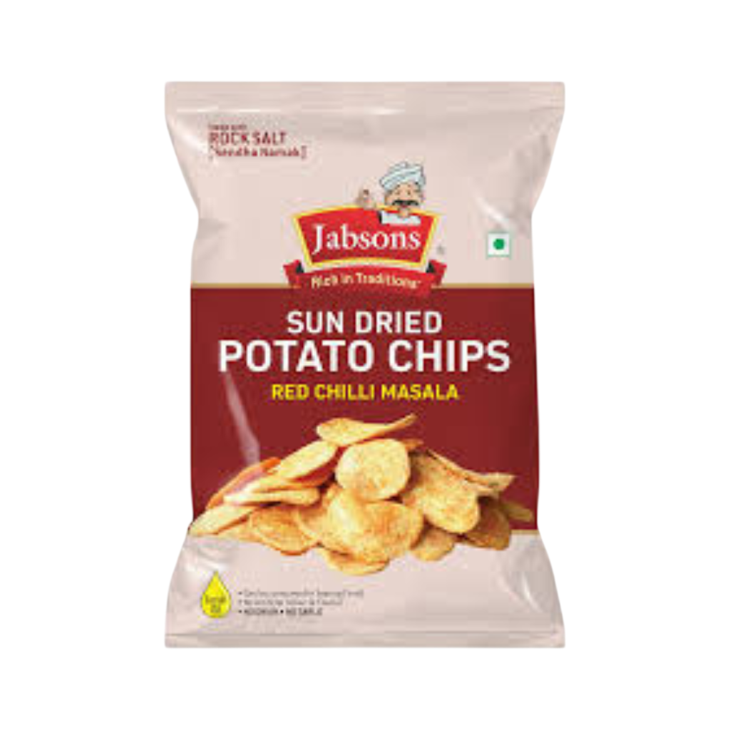 Jabsons Sun Dried Potato Chips Red Chilli Masala by Jabsons are traditional potato chips made from sun-dried potatoes and seasoned with spicy red chilli masala. They offer a crispy texture and bold flavor when cooked or fried. Perfect as a crunchy snack or side dish. Jabsons combines traditional preparation with premium ingredients.