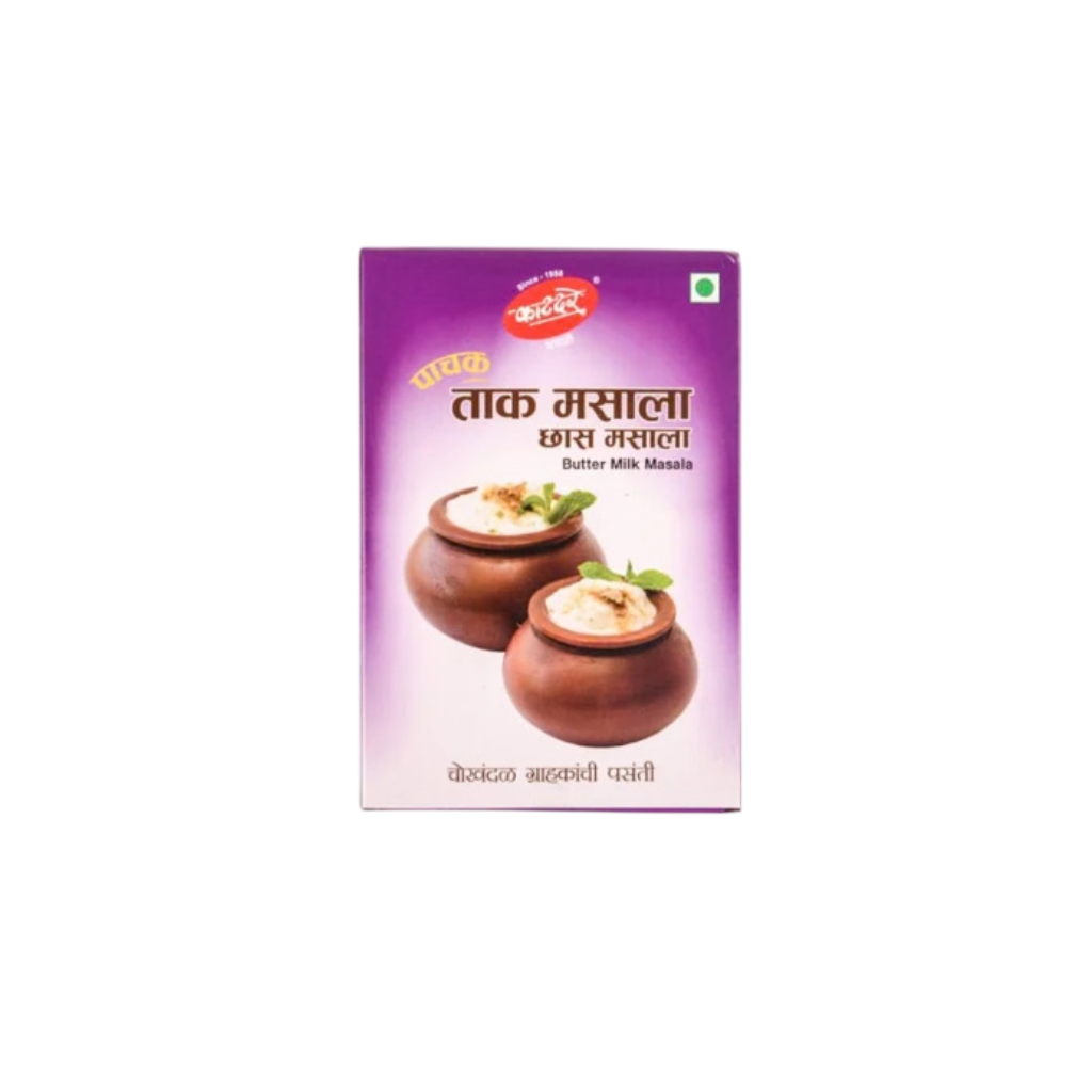 Katdare Butter Milk Masala 90g: Tangy spice blend specially crafted for enhancing buttermilk flavor. Adds refreshing taste and aroma. Perfect for traditional Indian drinks. Enjoy a flavorful cooling beverage.
