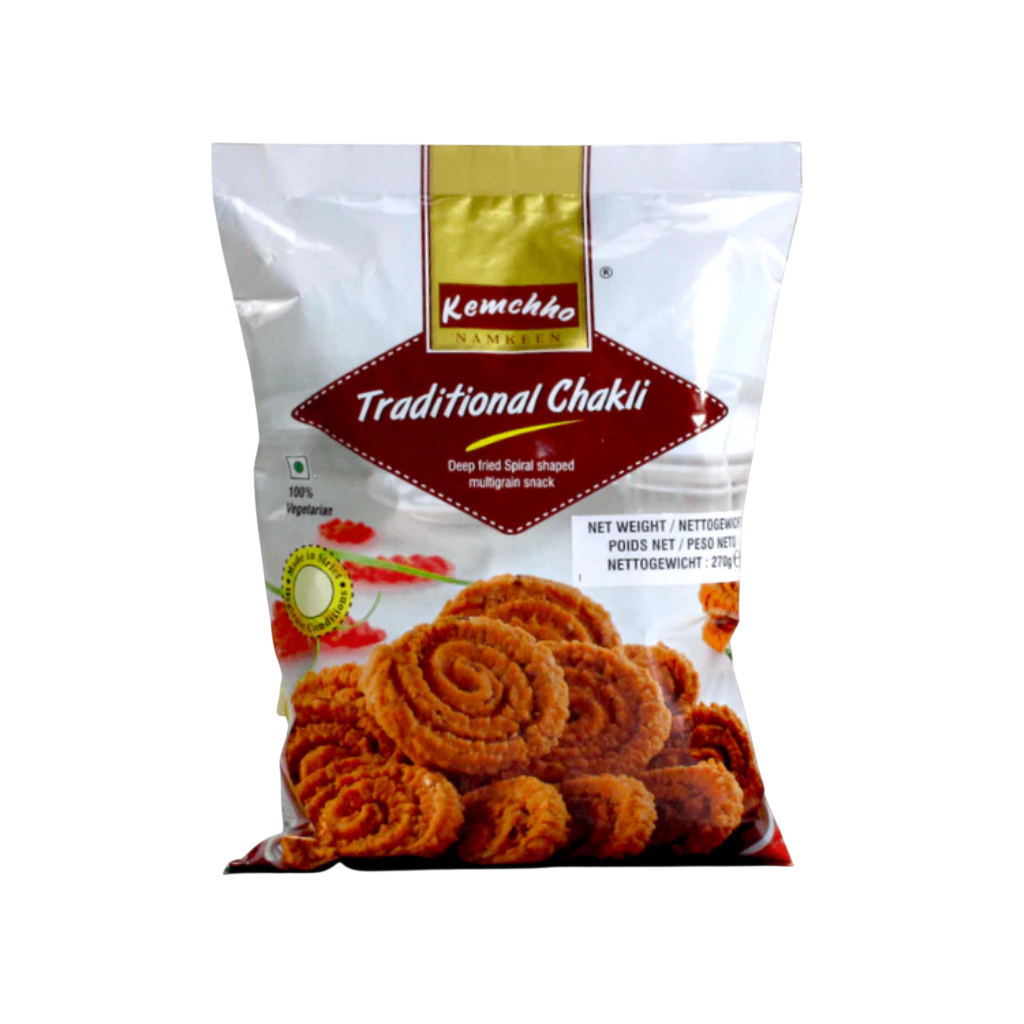 Kemchho Traditional Chakli 270g: Crispy spiral snack made from rice flour and spices. Authentic traditional taste. Perfect for festive occasions. Enjoy crunchy texture anytime.