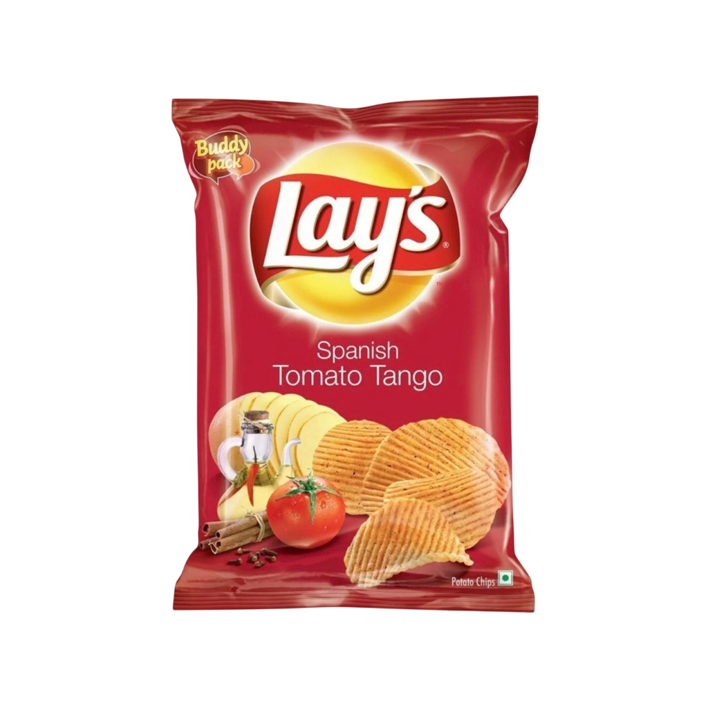 Lays Spanish Tomato: Crispy potato chips flavored with tangy Spanish style tomato seasoning. Sweet and savory taste with a crunchy texture. Perfect snack for any occasion. Enjoy the delicious tomato flavor.