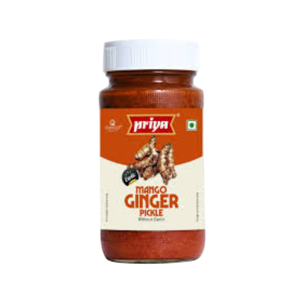 Priya Mango Ginger Pickle 300g: Delicious pickle made from mango ginger and aromatic spices. Offers a refreshing tangy taste. Perfect accompaniment for traditional Indian meals. Adds unique flavor and aroma.