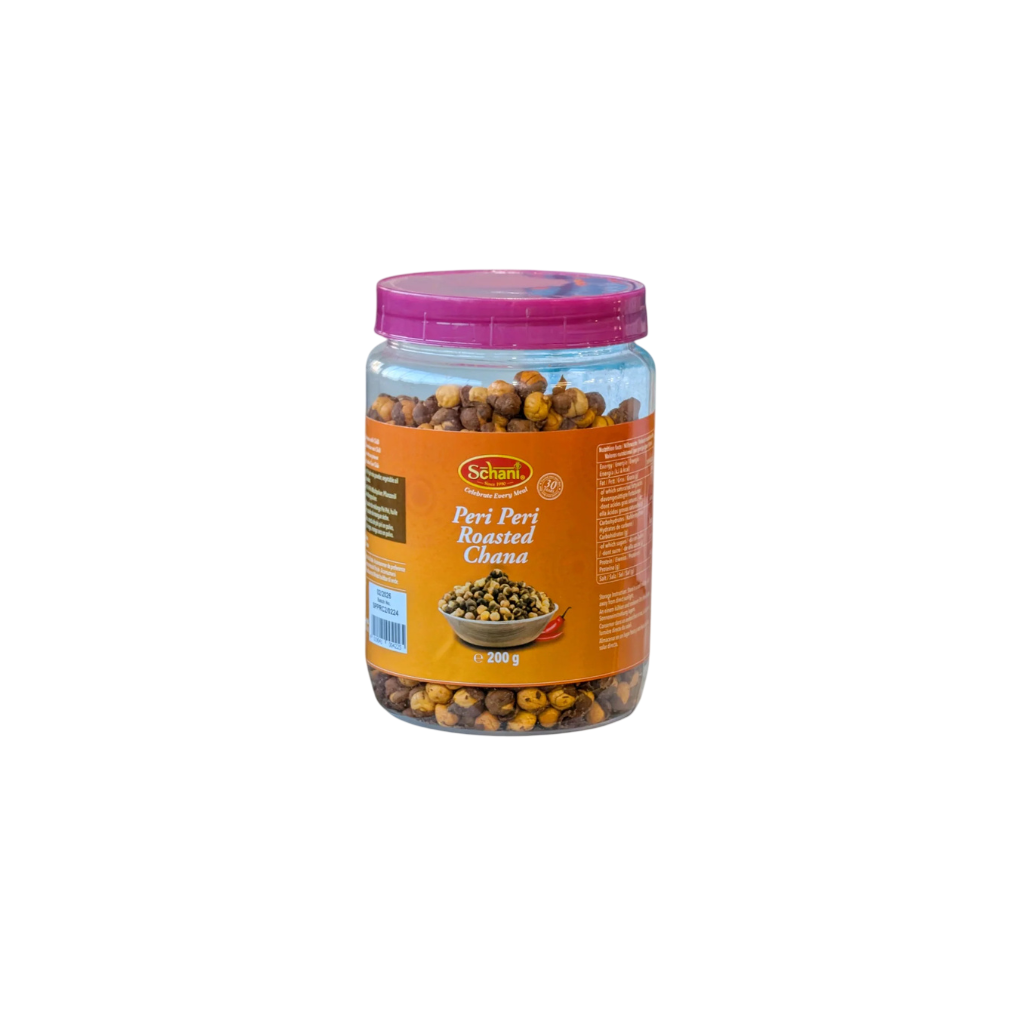 Schani Peri Peri Roasted Chana 200g: Crunchy roasted chana coated with peri peri seasoning. Spicy and tangy flavor. Healthy snack option. Perfect for munching.