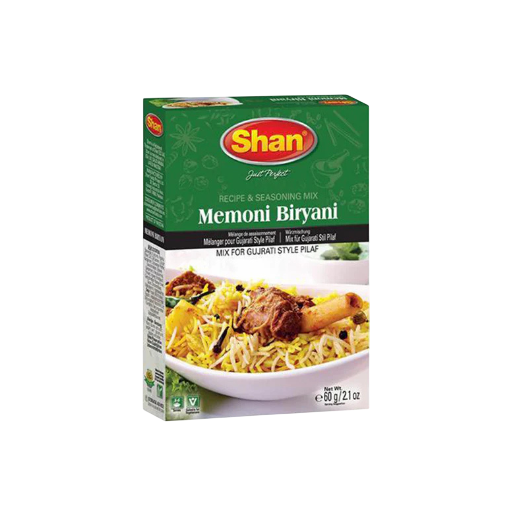 Shaan Memoni Mutton Biryani 60g: Special spice blend for preparing authentic Memoni style mutton biryani. Rich combination of traditional spices for bold flavor. Perfect for aromatic and flavorful rice dishes. Enjoy restaurant style biryani at home.