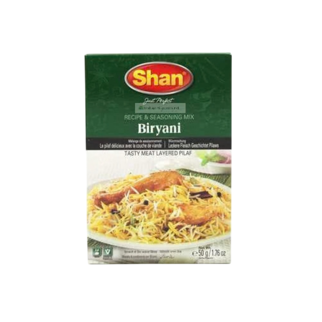 Shan Biryani Masala 50g: Classic spice blend for preparing flavorful biryani. Rich aroma and balanced spices enhance rice dishes. Suitable for chicken, mutton, or vegetable biryani. Perfect for traditional cooking.