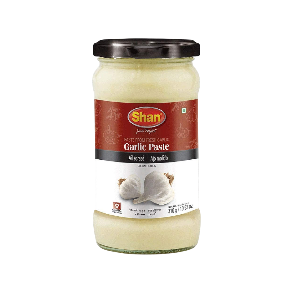 Shan Garlic Paste 310g: Fresh garlic paste prepared for convenient cooking. Adds strong aroma and flavor to dishes. Ideal for curries, marinades, and gravies. Saves time in the kitchen.
