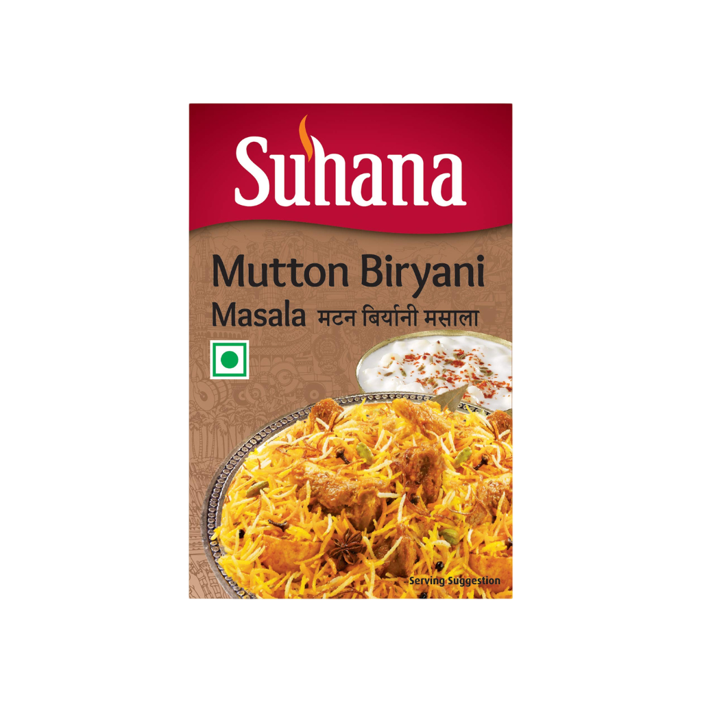 Suhana Mutton Biryani Masala 50g: Aromatic spice blend specially crafted for preparing delicious mutton biryani. Combines traditional spices for authentic taste. Perfect for rich and flavorful rice dishes. Enjoy restaurant-style biryani at home.