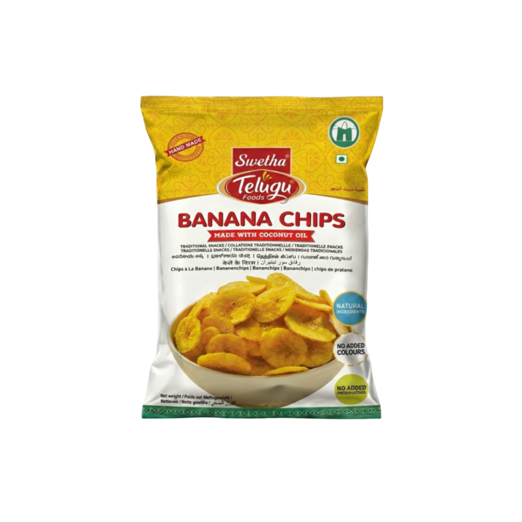 Telugu Banana Chips 100g: Crispy banana chips made from carefully sliced raw bananas and lightly salted. Fried to perfection for a crunchy texture. Popular South Indian snack loved by all ages. Perfect for tea-time or casual snacking.